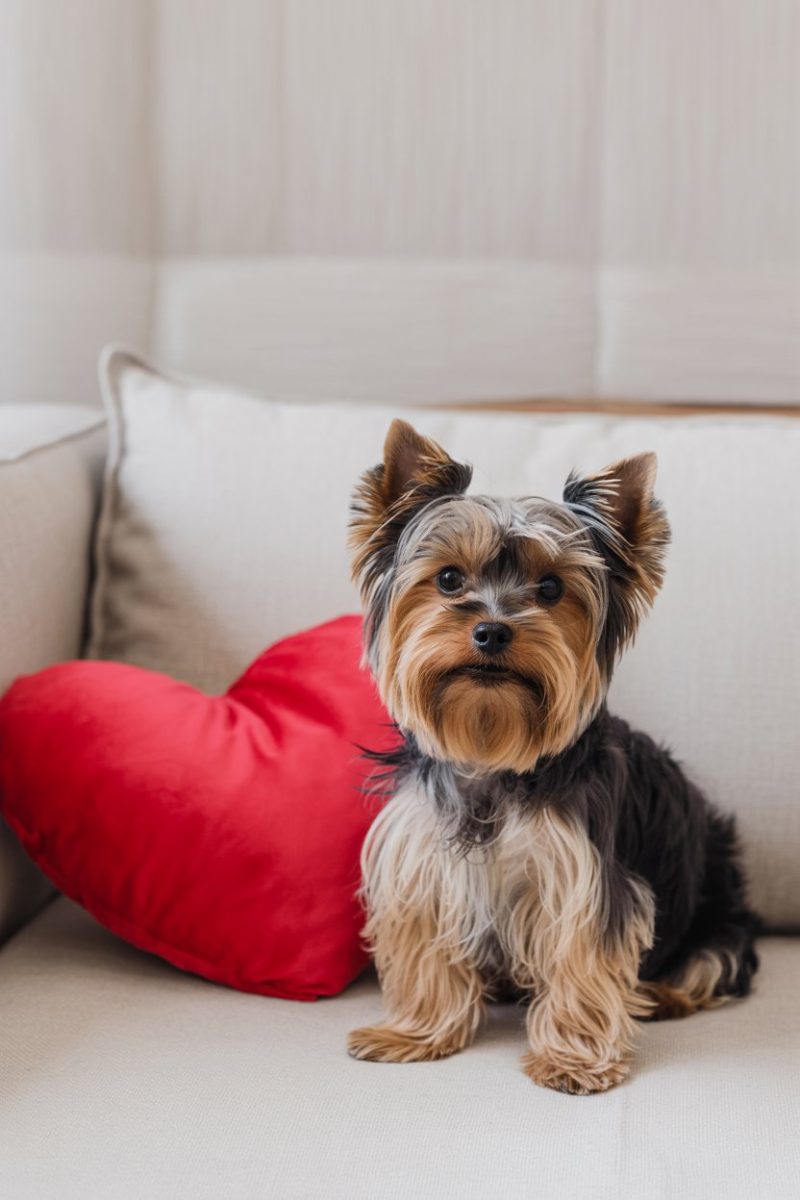 This adorable Yorkie is sitting pretty next to a fluffy heart-shaped pillow. With its shiny coat and curious expression, it’s hard not to smile at this little cutie. Moments like these remind us why we love our furry friends so much!