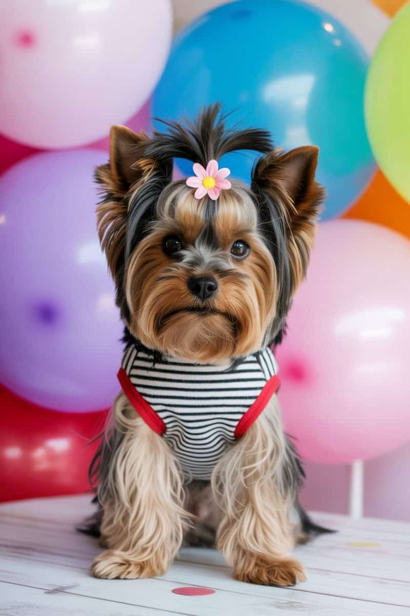 Yorkshire Terriers look adorable when dressed up! This little pup in a striped outfit and a cute hair accessory is a perfect example. Their playful personalities shine even brighter in fun costumes.