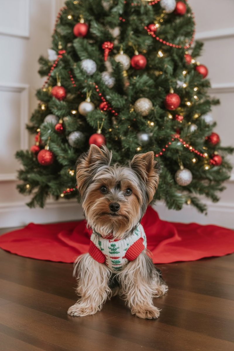 This adorable Yorkie is ready for the holidays in a festive Christmas sweater. With its cute little outfit and charming expression, it captures the spirit of the season perfectly. Who can resist such a sweet sight by the Christmas tree?