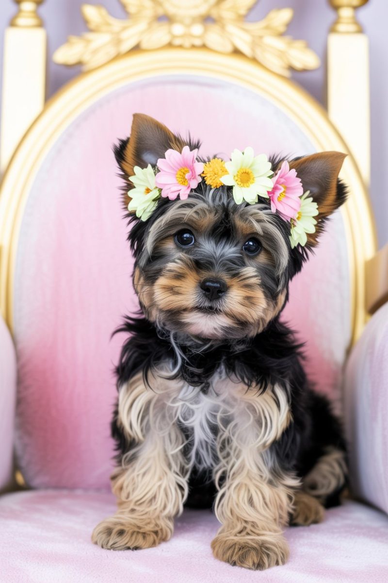This adorable Yorkie puppy is stealing hearts while wearing a charming flower crown. Sitting regally on a fancy chair, she looks like a little princess ready for a fairytale. With her sweet expression and playful spirit, she truly proves that tiny is mighty!